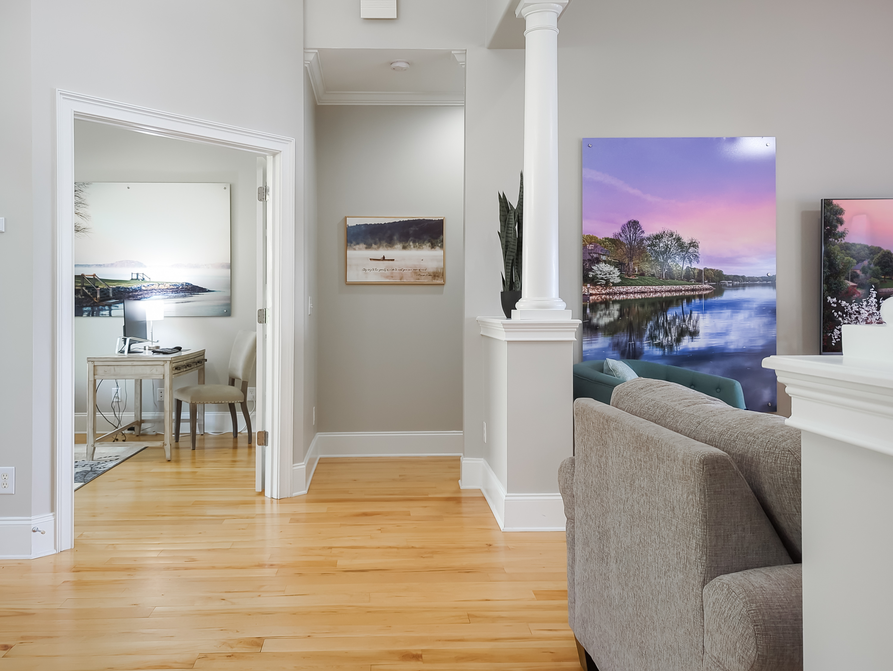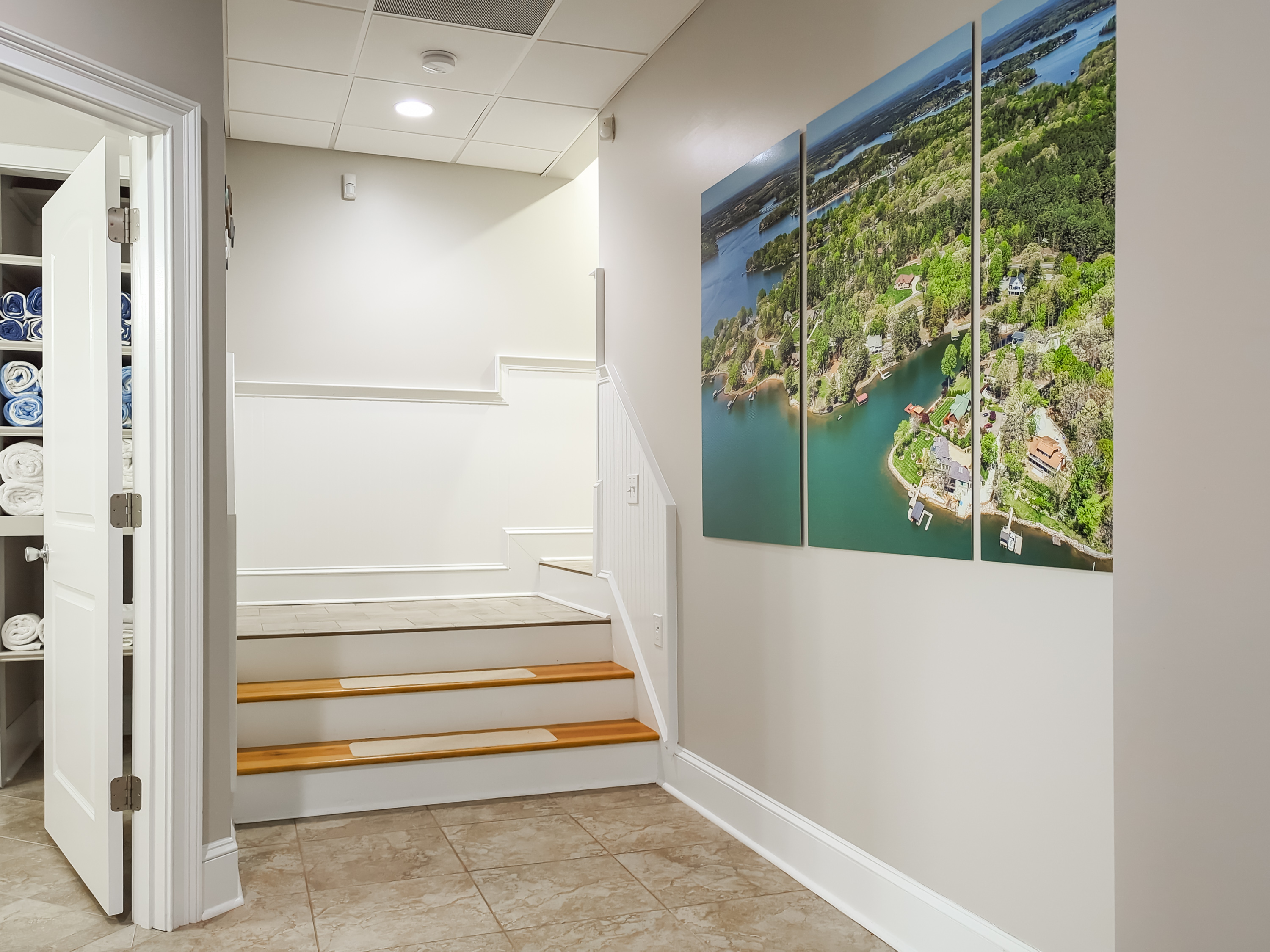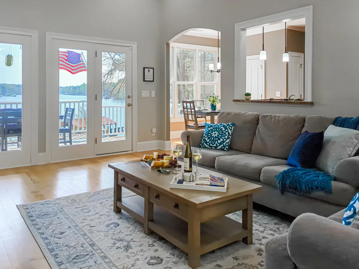 Upon entry, you are instantly greeted by a serene interior and expansive views of the lake.