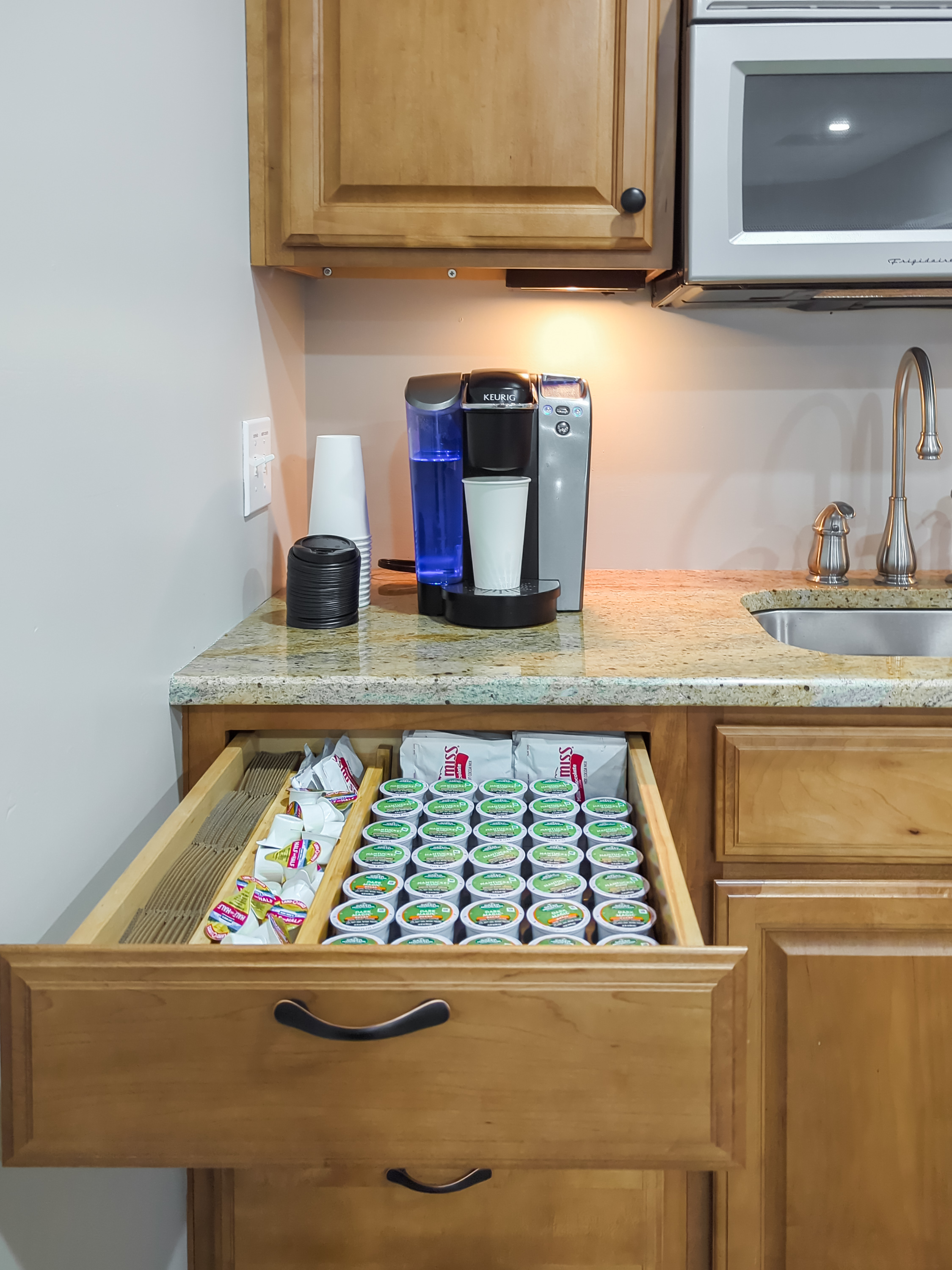 Morning drinks are important so we provide everything to make that perfect cup. Our Keurig also makes ICED coffee! Just look for the special Iced K-cups in our K cup drawer.