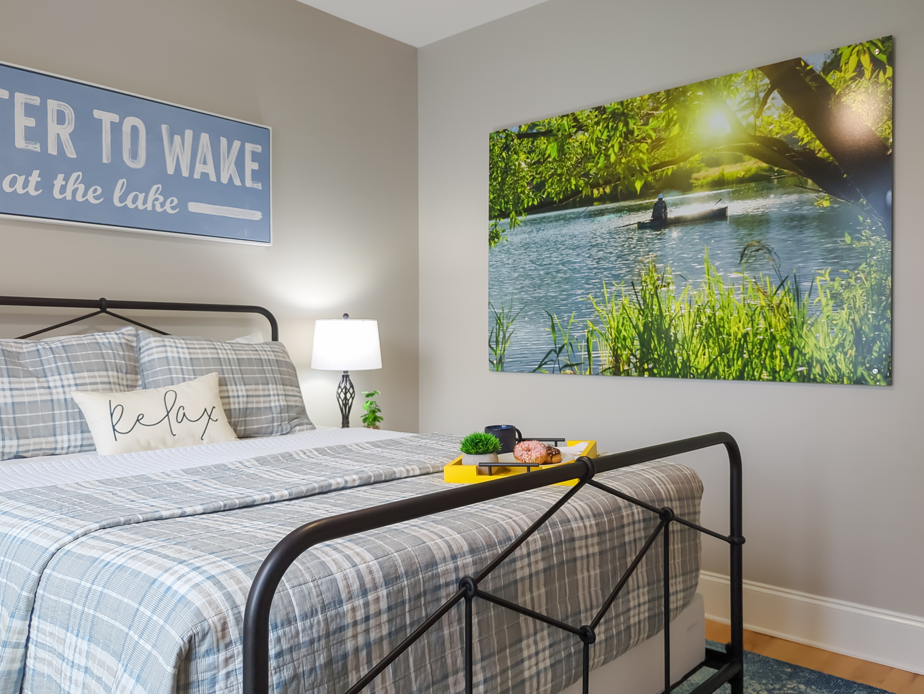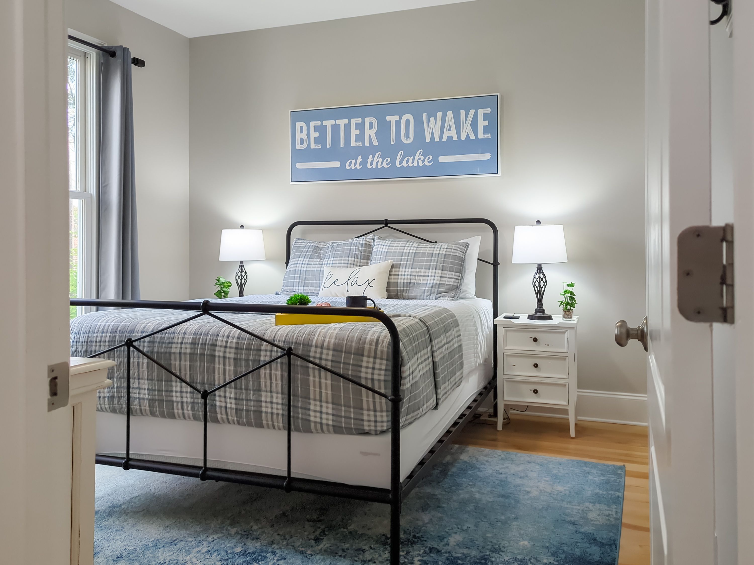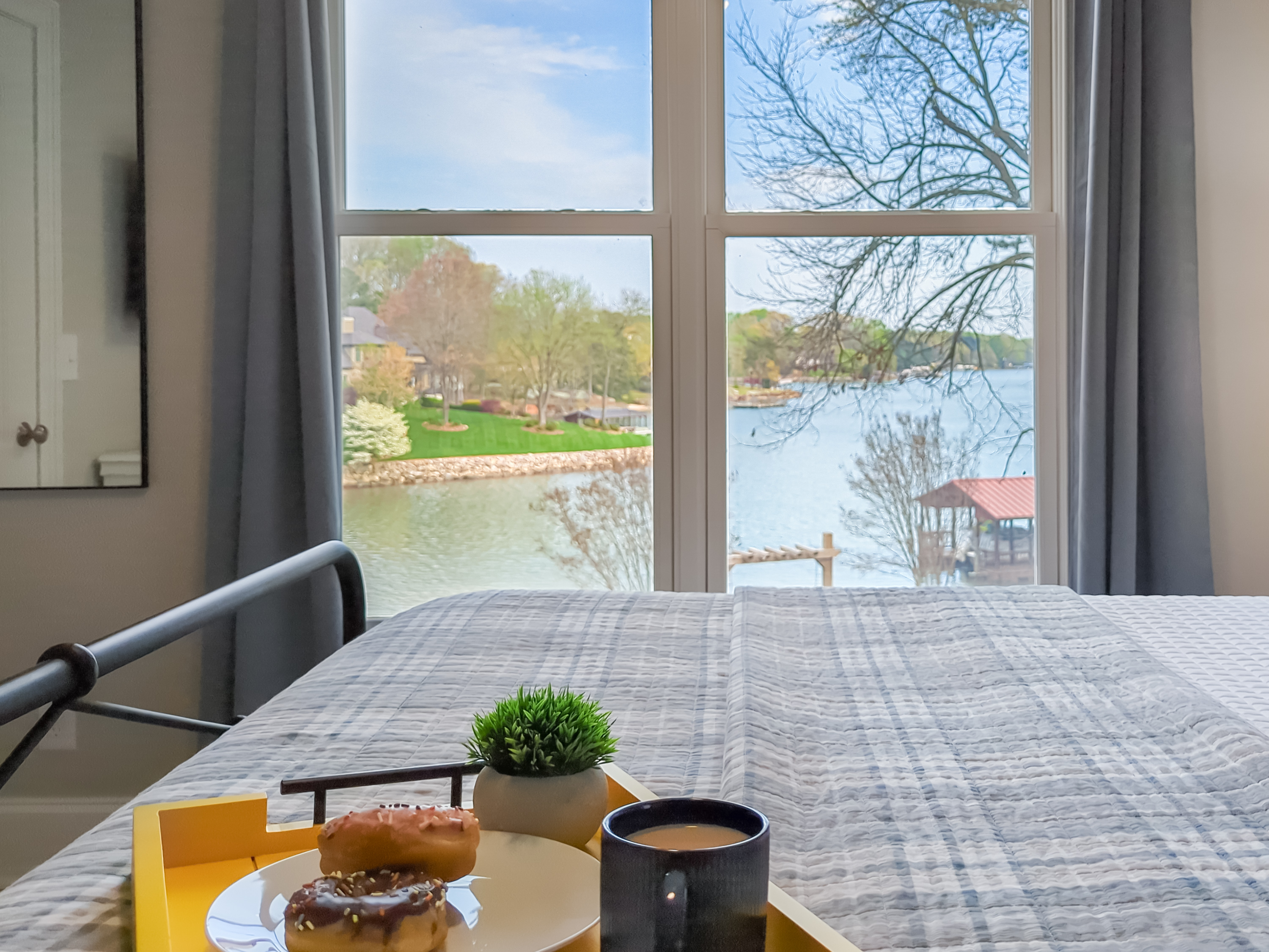 Queen sized bedroom with shared bathroom on main floor with water views. Inductive cell charger, suitcase stand, full length mirror, blackout curtains and TV included.