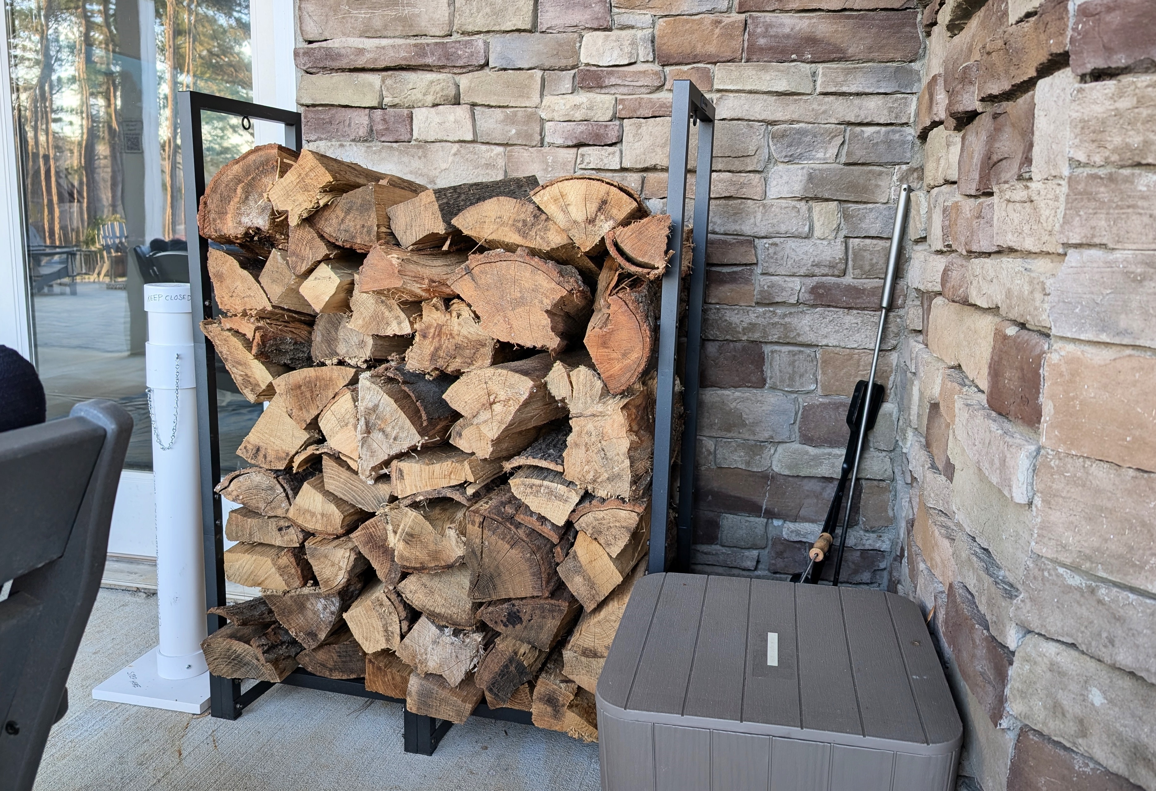 Firepit tools and a supply of wood provided.