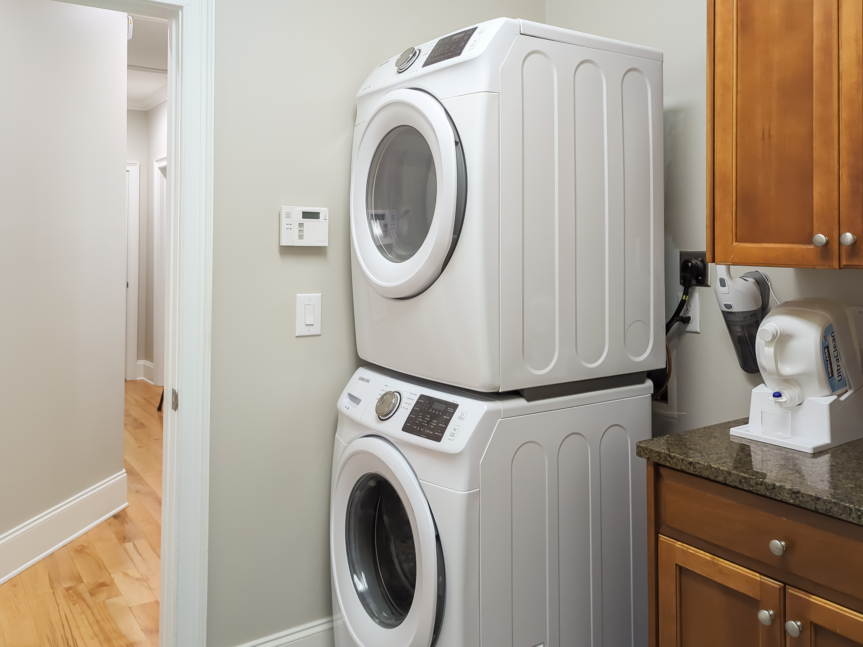 Full size washer and dryer for your use. Detergent is provided.
