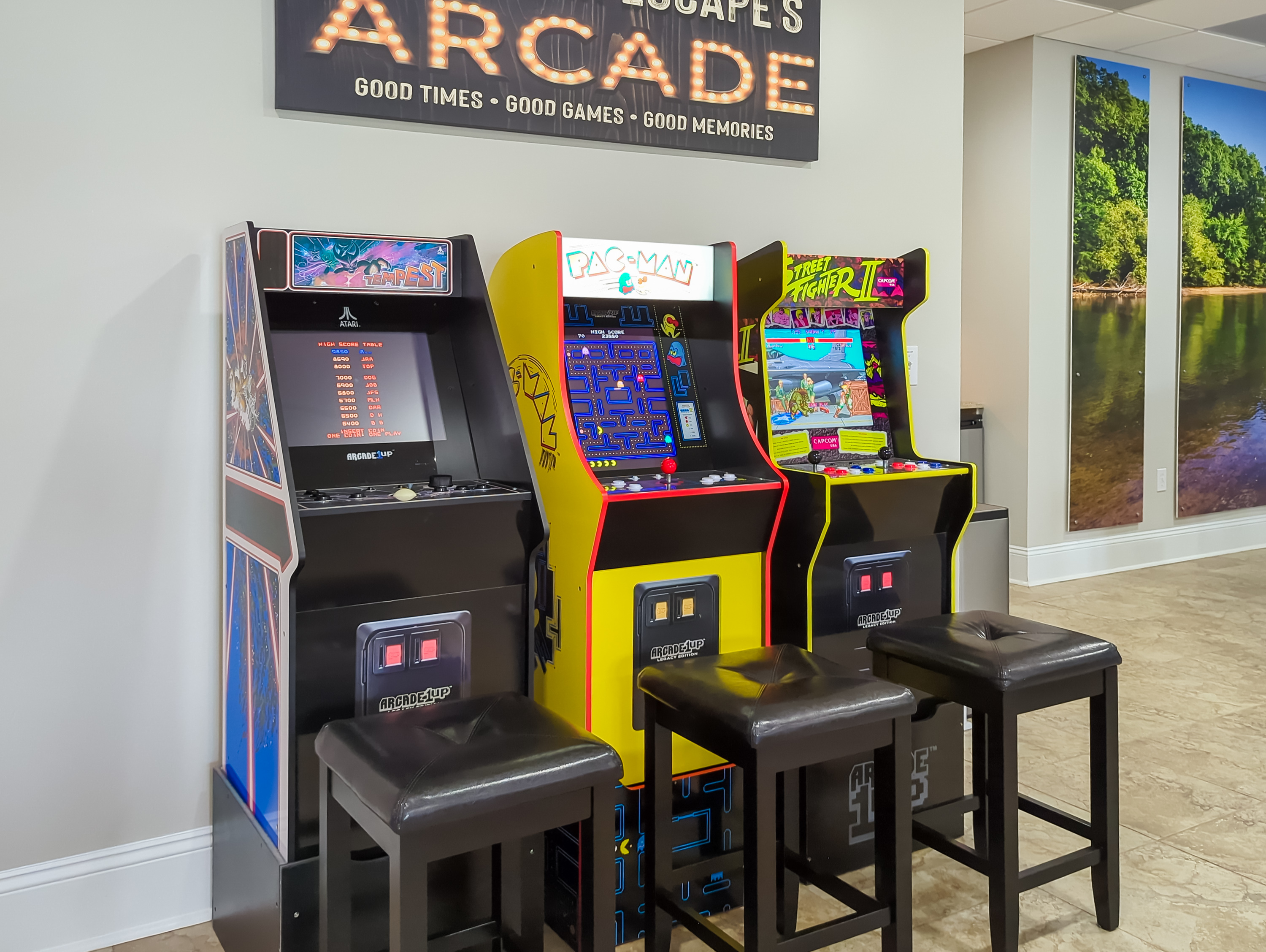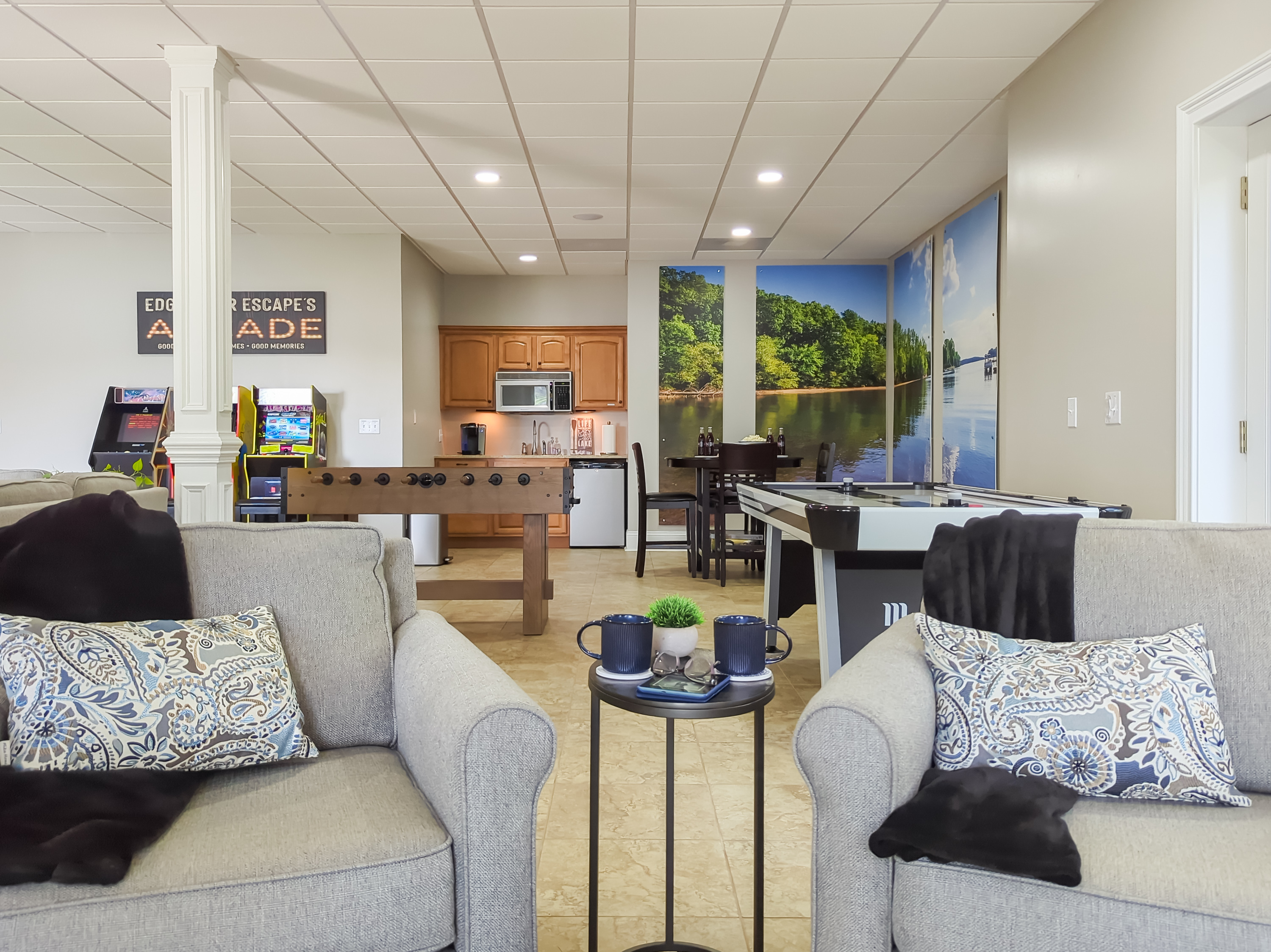 The game room features air hockey, foosball, arcade machines and a 75" TV.