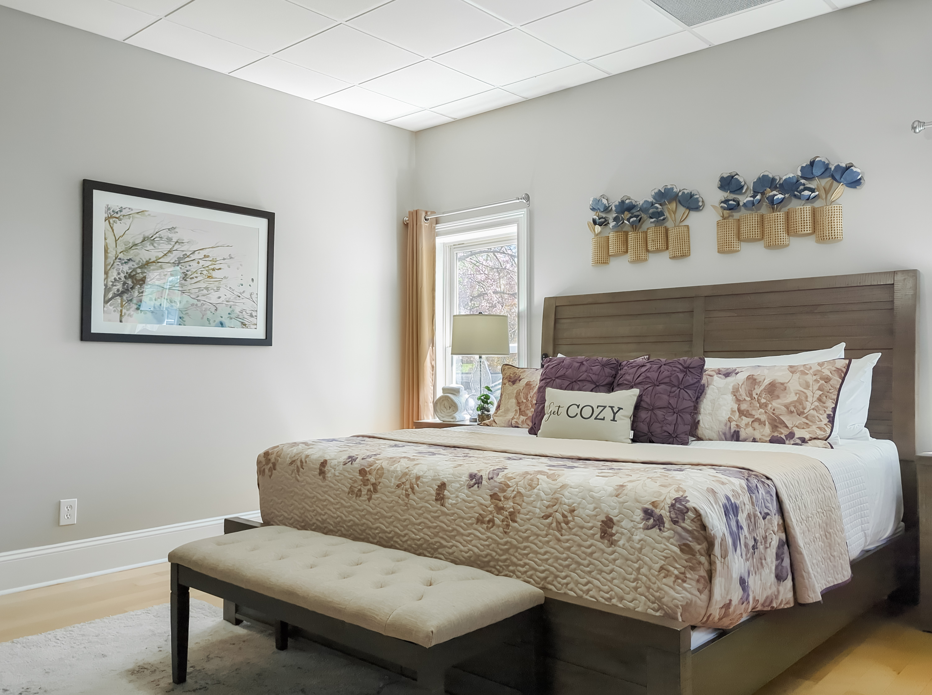 Ground level king size bedroom with room darkening curtains, luggage rack, mirror & inductive chargers