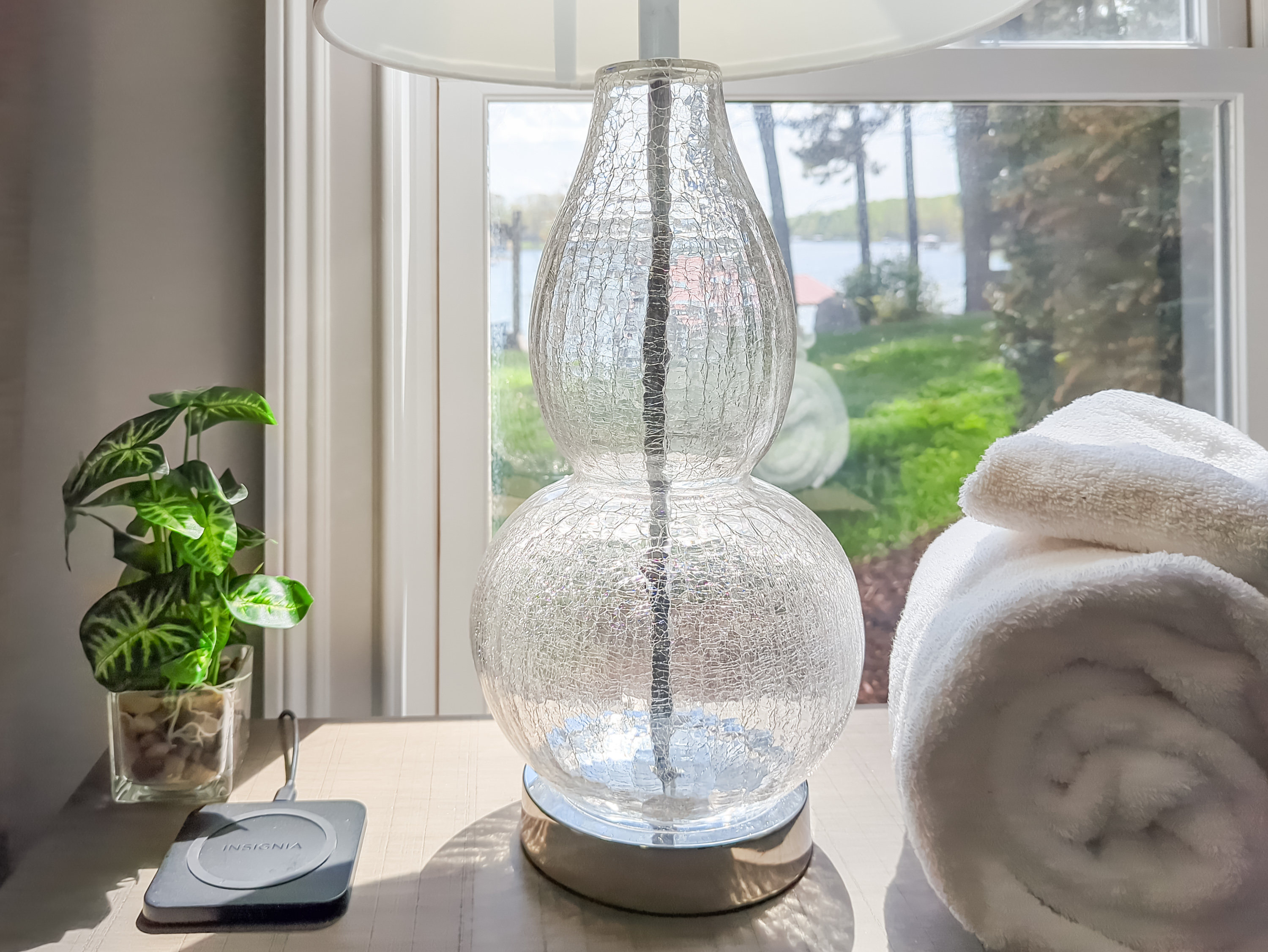 Primary suite with King bed, cell phone inductive chargers, suitcase stand, TV and water views.