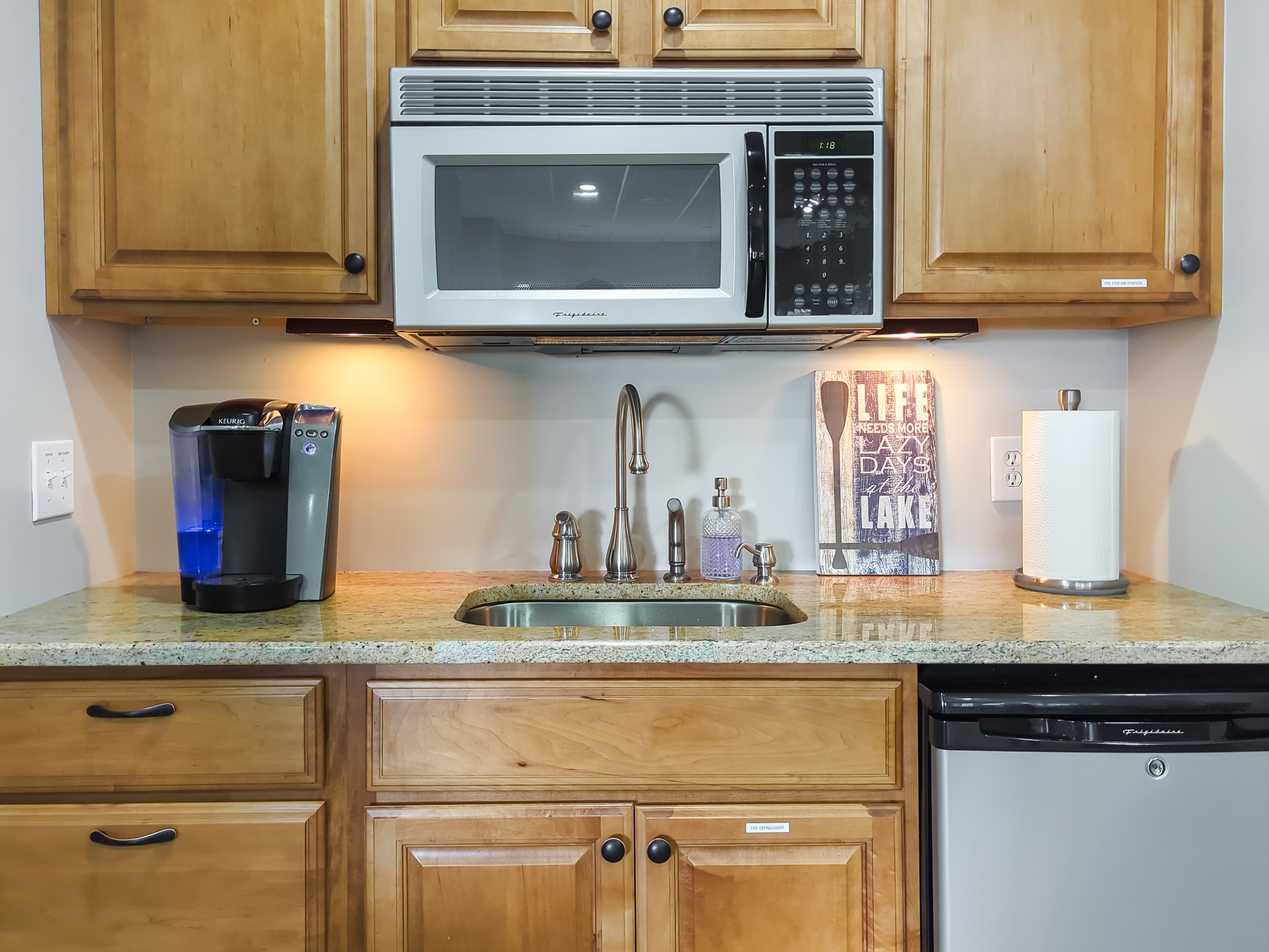 Ground level kitchette featuring a Keurig, microwave, sink and mini fridge.