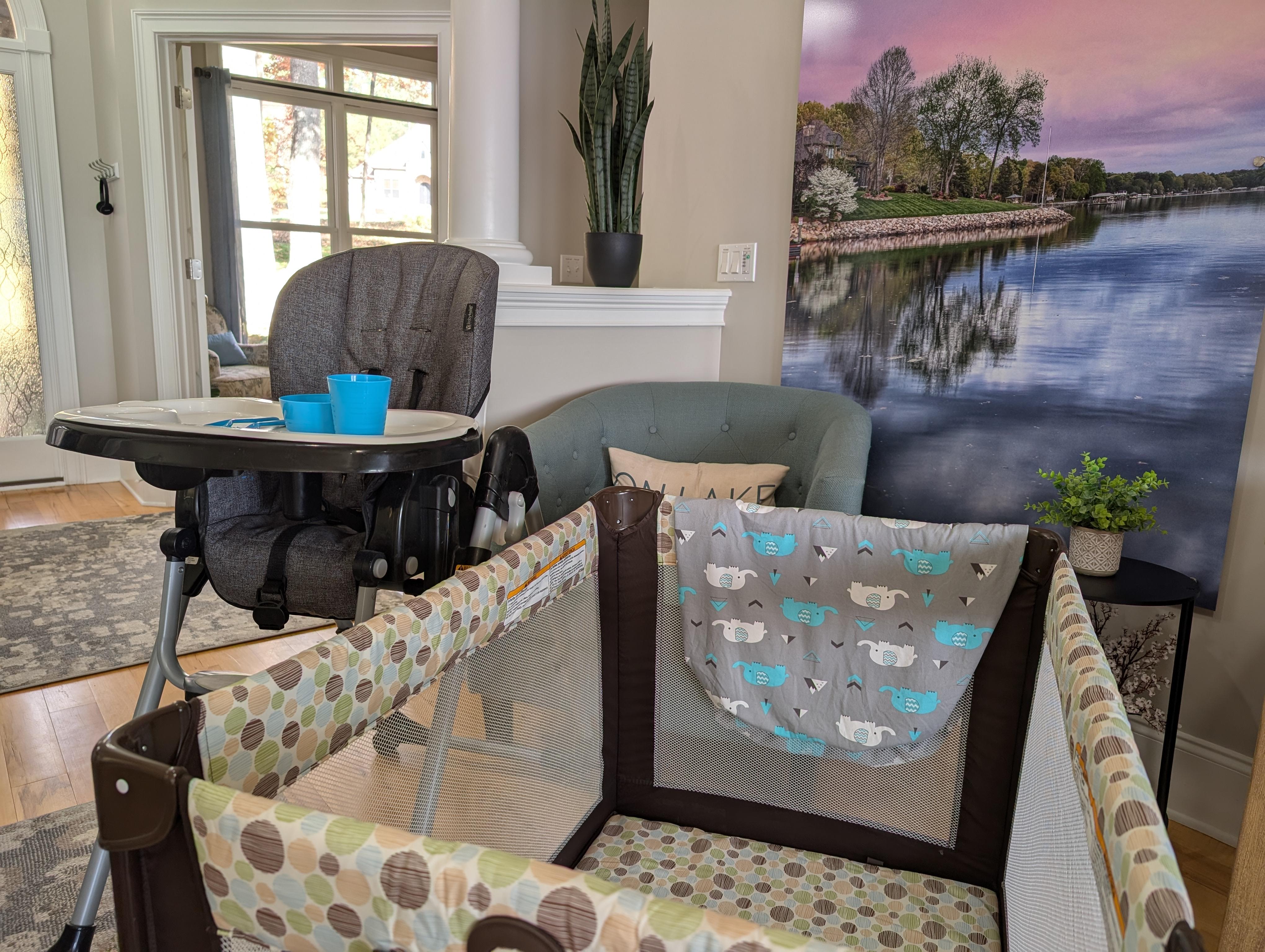 Pack n Play, sheets, high chair and plastic plates/cup are provided.