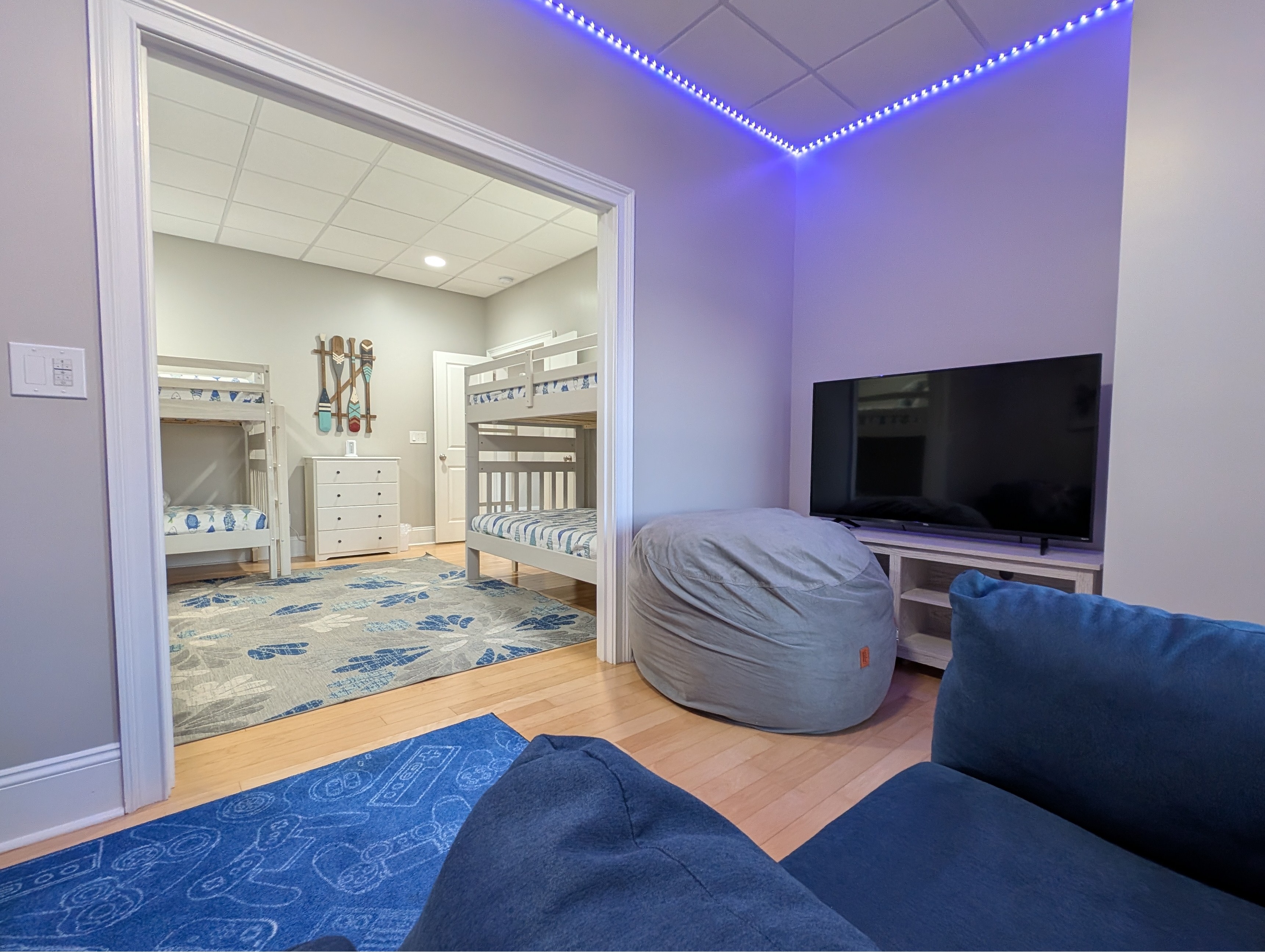 The adjoining room acts as the kids own hang out room with a TV.