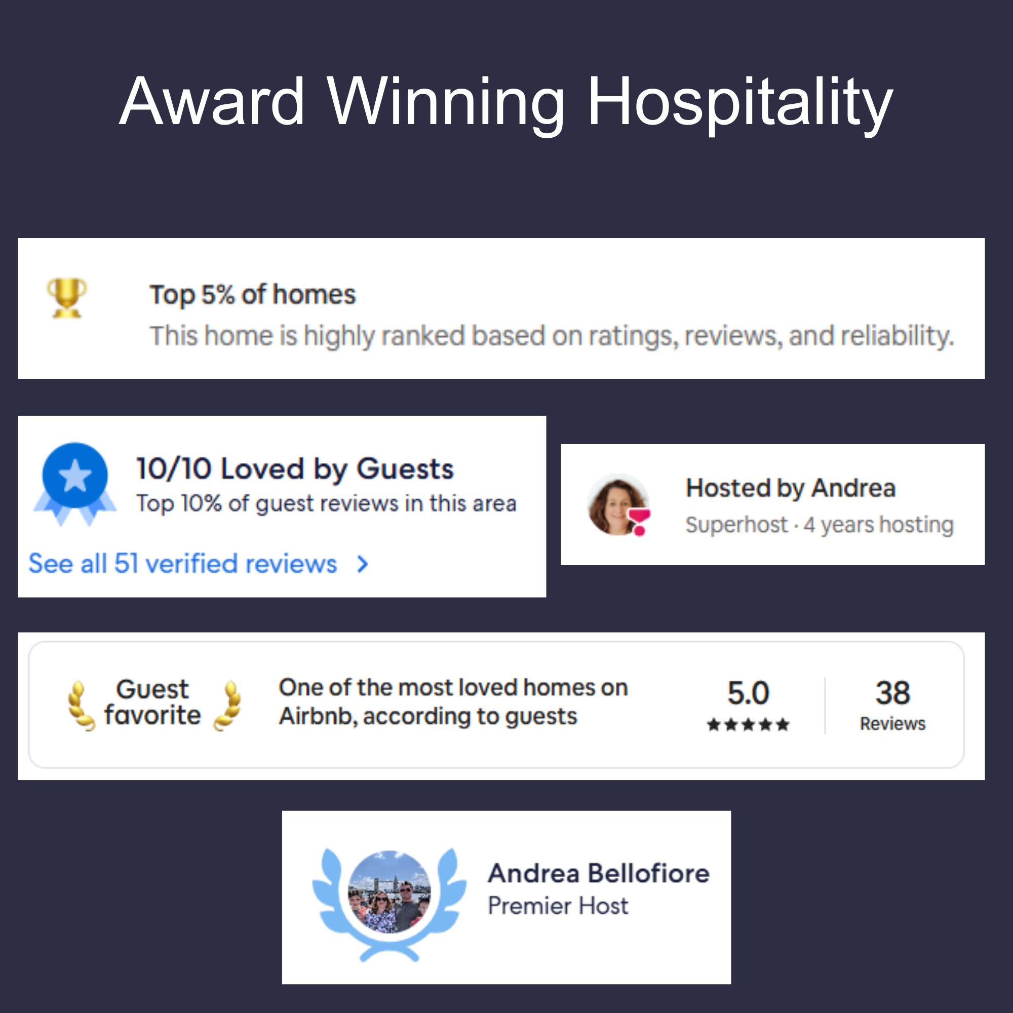 Andrea manages the guest experience with the kind of care that has earned recognition you simply can't fake — a 5.0 perfect rating, Airbnb Superhost status, VRBO Premier Host designation, and a spot in the top 5% of homes nationally based on ratings, reviews, and reliability. Over 85 verified five-star reviews and counting.